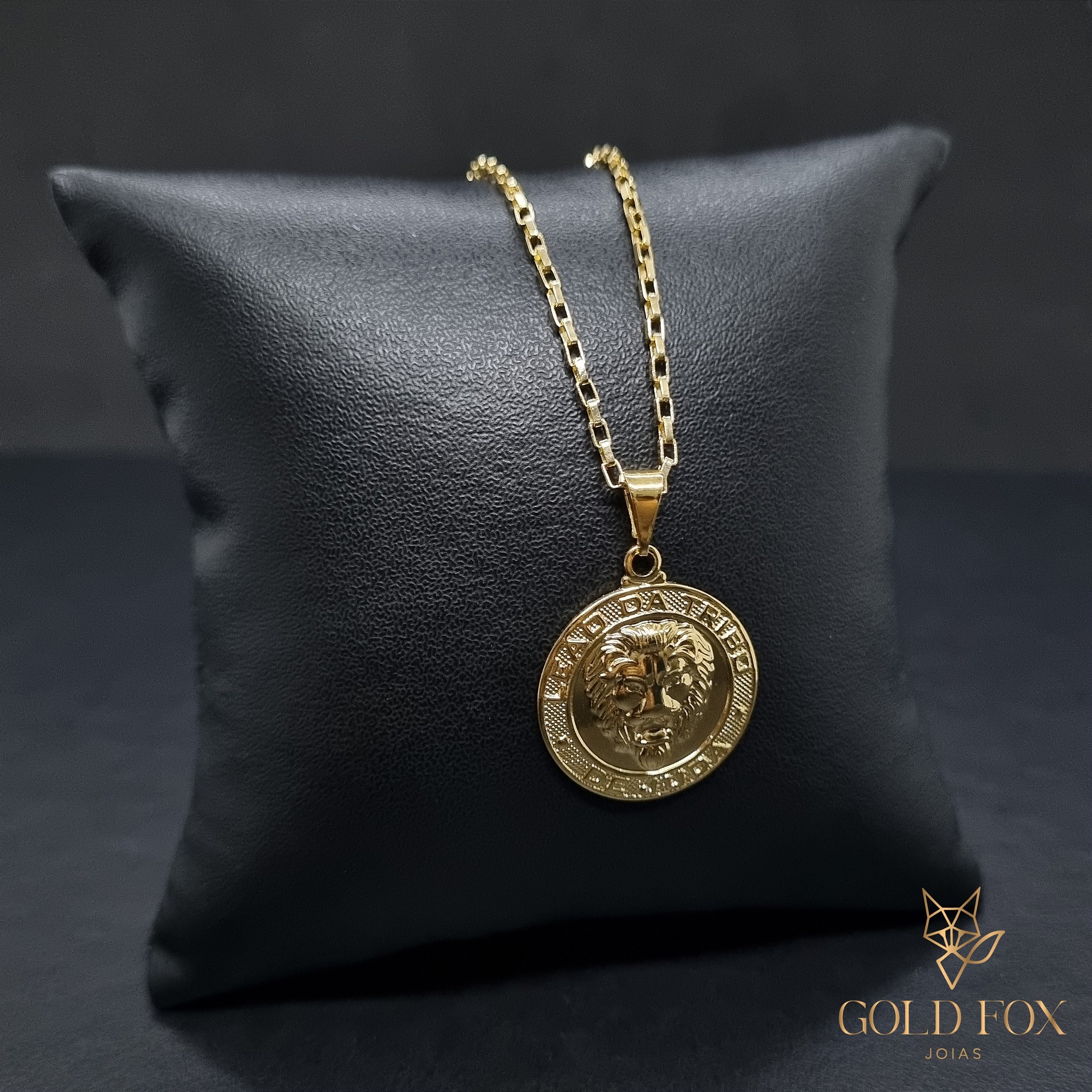 CONJUNTO CORRENTE TIJOLINHO 1,5 MM FECHO ARGOLINHA (60 CM) + PINGENTE MEDALHA LEÃO DE JUDÁ - BANHADO A OURO 18K